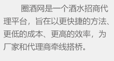圈酒招商網(wǎng)是繼糖酒會之后的招商模式,為酒廠等生產(chǎn)經(jīng)銷企業(yè)搭建一個更好、更快的酒水招商平臺